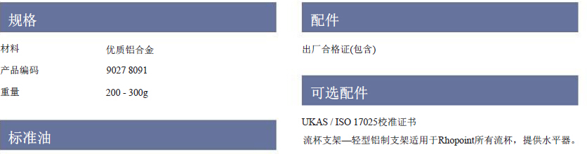 由優質鋁合金杯身和不銹鋼流嘴制成,Rhopoint PAINTLAB +流杯適用于UKAS /ISO 17025認證標準油且符合測量規格。