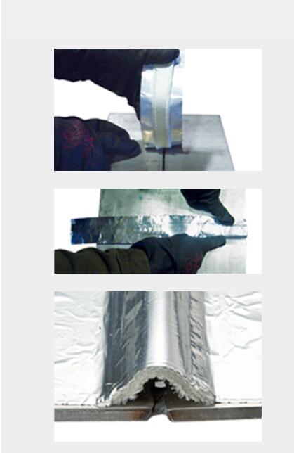 將膠帶的粘合部分沿根部間隙兩側壓在基材上,繼續將玻璃纖維條置中。記得在焊接過程中把釋放襯里從鋁帶上剝離。該工藝確保鋁膠帶上的粘合劑無雜質和異物。